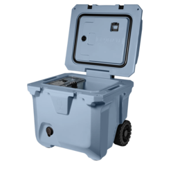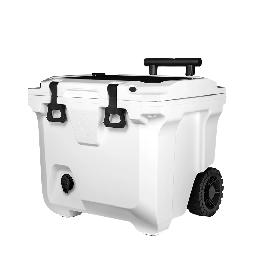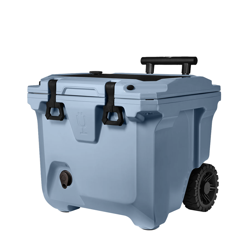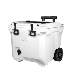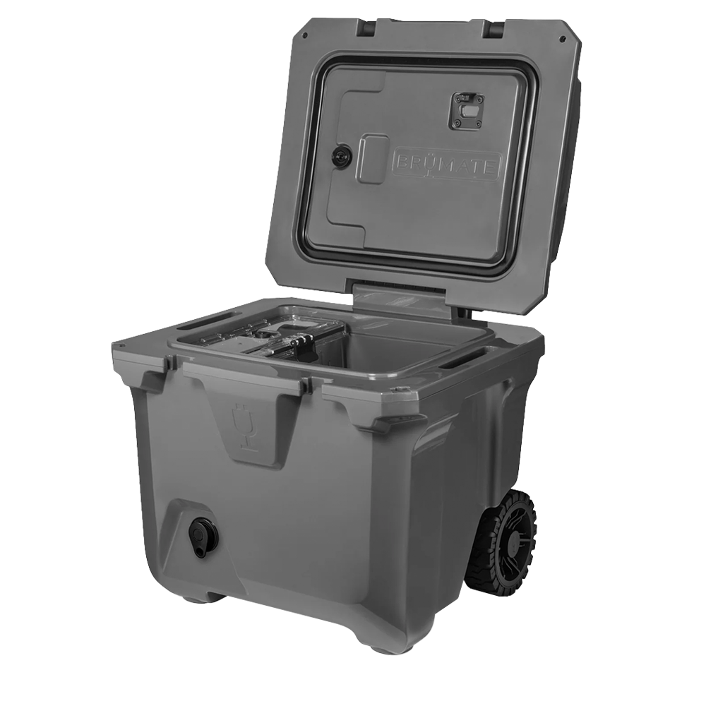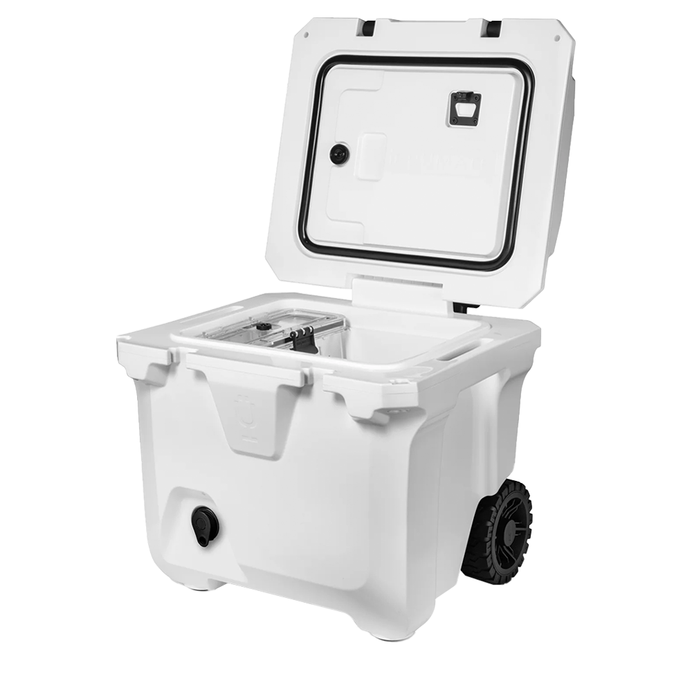Now in a 30% lighter and compact size, the Brumate Brutank 35 QT Rolling Cooler makes it easier than ever to bring your drinks, cocktails, and snacks to backyard BBQ’s and weekend work events. The durable roto-molded insulation will retain ice for over 7 days and can fit plenty of 12 oz cans, bottles of wine, and bags of ice. Use the removable drink tank to mix up a cocktail and easily serve out of the built-in tap so you can keep your cooler closed and mess-free. The collapsible telescoping handle and all-terrain wheels allows you to traverse any ground area with ease.