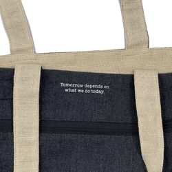 - 12 oz reversible tote bag with generous front zippered pocket, 5" gusset and 24" handle